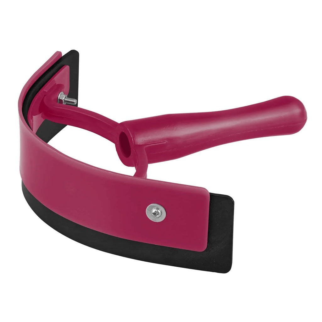 Plastic sweat scraper with ergonomic handle. Rigid one side for removing excess water and rubber on the other for getting more water out of the coat.
