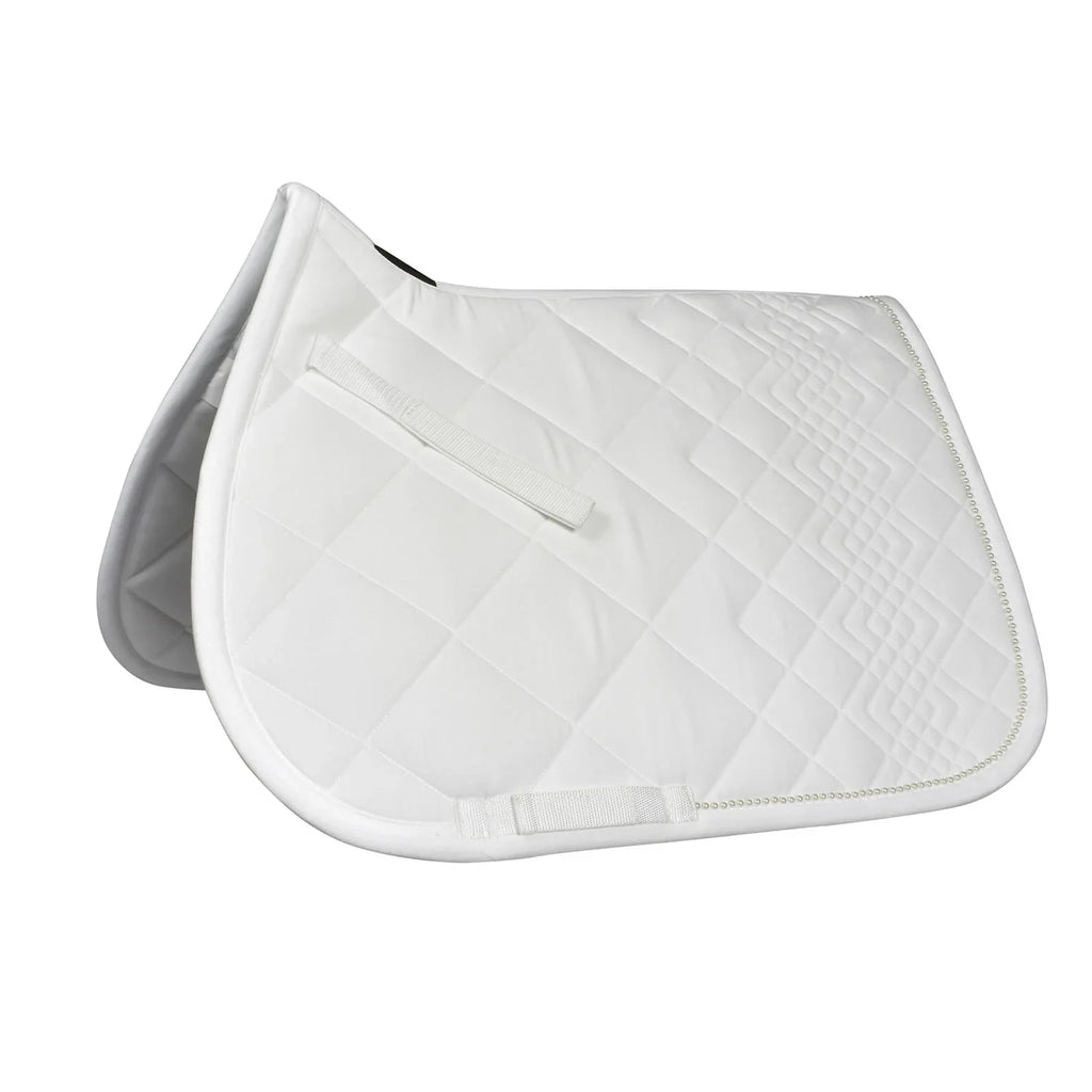 More rounded than the dressage pad and smaller in size. Includes decorative pearl edging, pinstripe glitter fabric, moisture wicking lining and total girth straps.