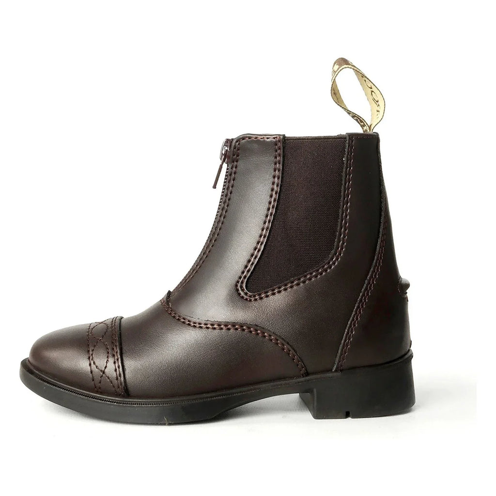 This boot is based on the bestselling adults boot but is made entirely from a soft synthetic leather which is exceptionally durable and requires very little aftercare. Perfect for younger riders who want to spend more time in the saddle! The toecap is reinforced and decorated with a simple yet attractive brogue design and the durable sole features an anti-clip design. There is a single rubber spur stud on the heel to keep spurs in place and avoid any wear and tear.