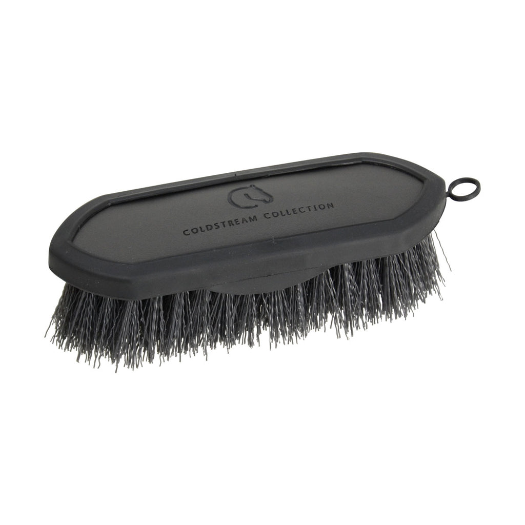 Faux leather backed dandy brush with rubber edge for extra grip. Made with stiff PP bristles, perfect for easy removal of mud.
