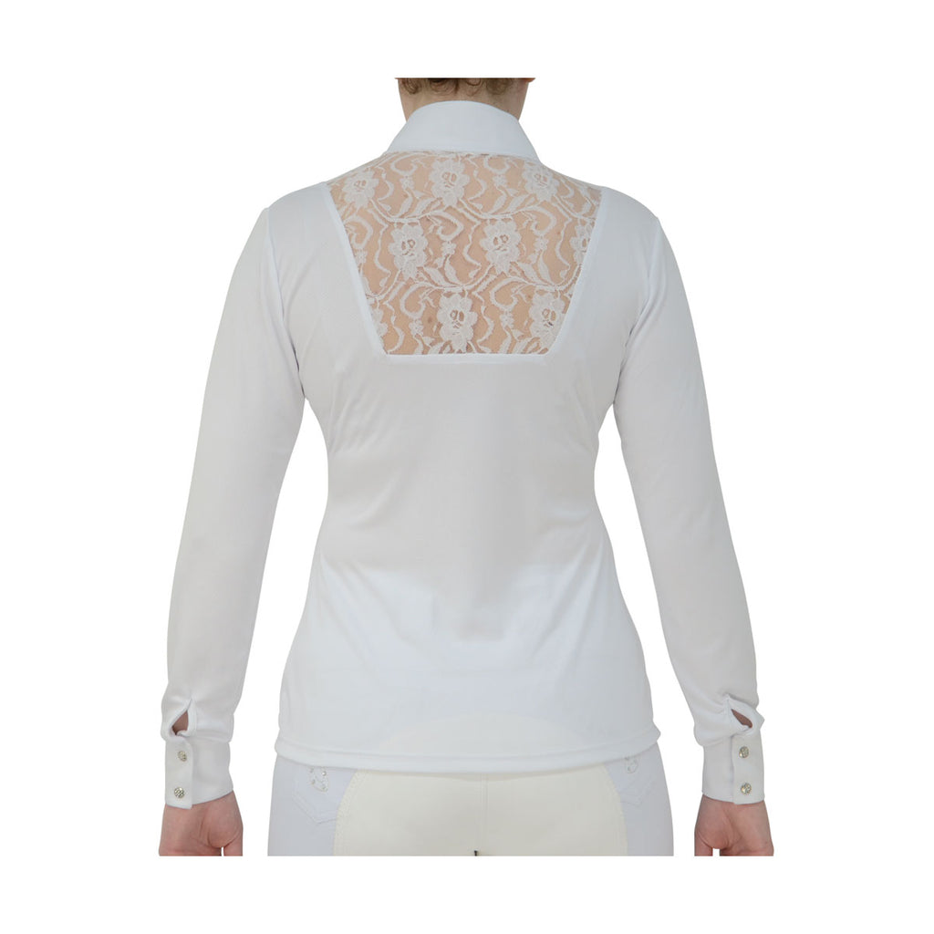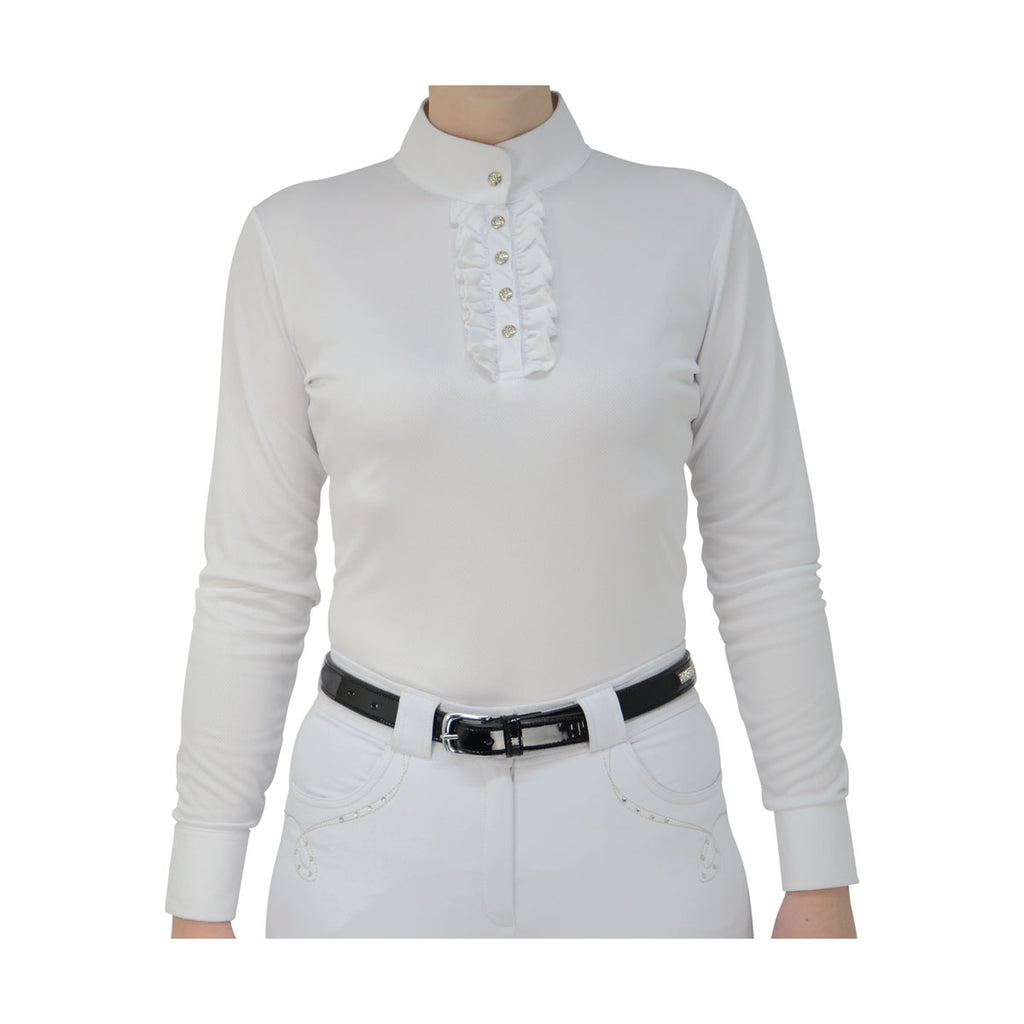 A long sleeved show shirt with stunning cut out lace detail on the back which can be easily concealed when wearing a jacket. Made from a technical fabric which is comfortable, breathable and incorporates bi-stretch for added freedom. With pretty ruffle detailing along the placket, 2 crystal diamantes on both the sleeves and 5 crystal buttons down the front placket. A must have for the dressage enthusiast!