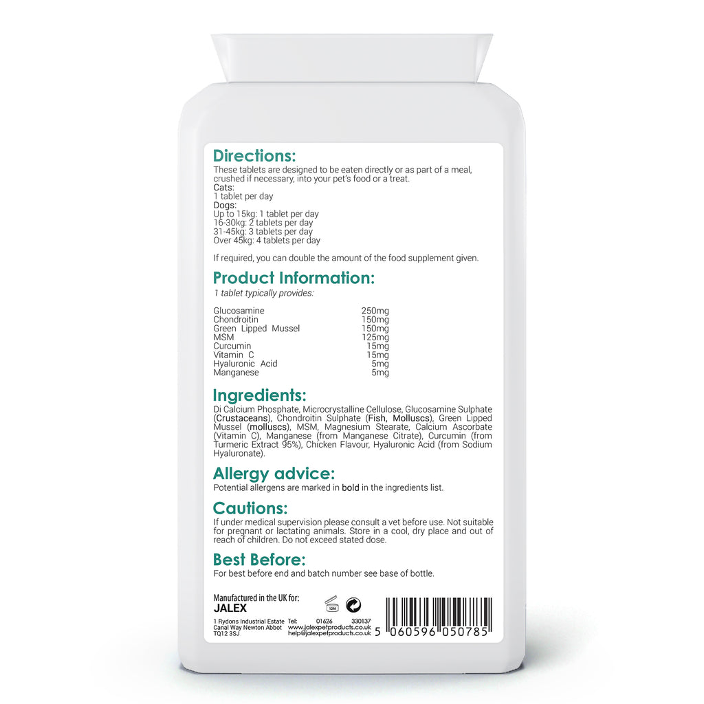 Ingredients: Di Calcium Phosphate, Microcrystalline Cellulose, Glucosamine Sulphate (Crustaceans), Chondroitin Sulphate (Fish, Molluscs), Green Lipped Mussel (molluscs), MSM, Magnesium Stearate, Calcium Ascorbate (Vitamin C), Manganese (from Manganese Citrate), Curcumin (from Turmeric Extract 95%), Chicken Flavour, Hyaluronic Acid (from Sodium Hyaluronate).