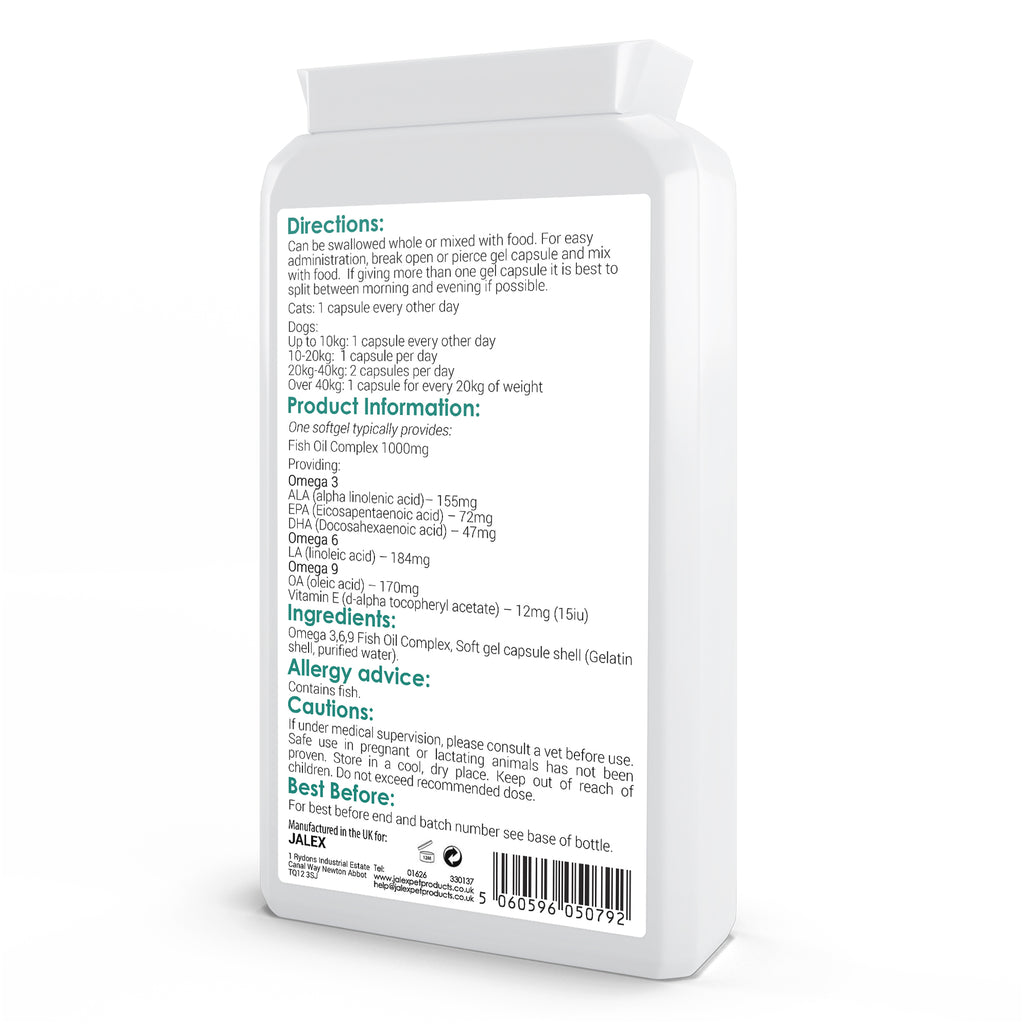 A high quality Omega 3,6,9 supplement for pets presented in a soft gel capsule. Essential omega oils are the ultimate nutrition to support healthy skin and coat in cats and dogs. Easy to administer either eaten whole or punctured and mixed with food.