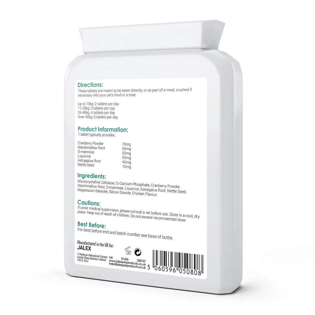 Ingredients 1 tablet typically provides: Cranberry Powder 75mg Marshmallow Root 50mg D-mannose 50mg Liquorice 50mg Astragalus Root 40mg Nettle Seed 10mg Ingredients: Di Calcium Phosphate, Microcrystalline Cellulose, Cranberry Powder, Marshmallow Root, D-mannose, Liquorice, Astragalus Root, Nettle Seed 10mg, Magnesium Stearate, Chicken Flavour.