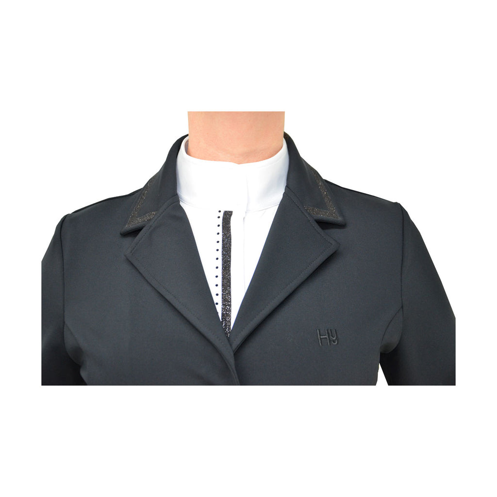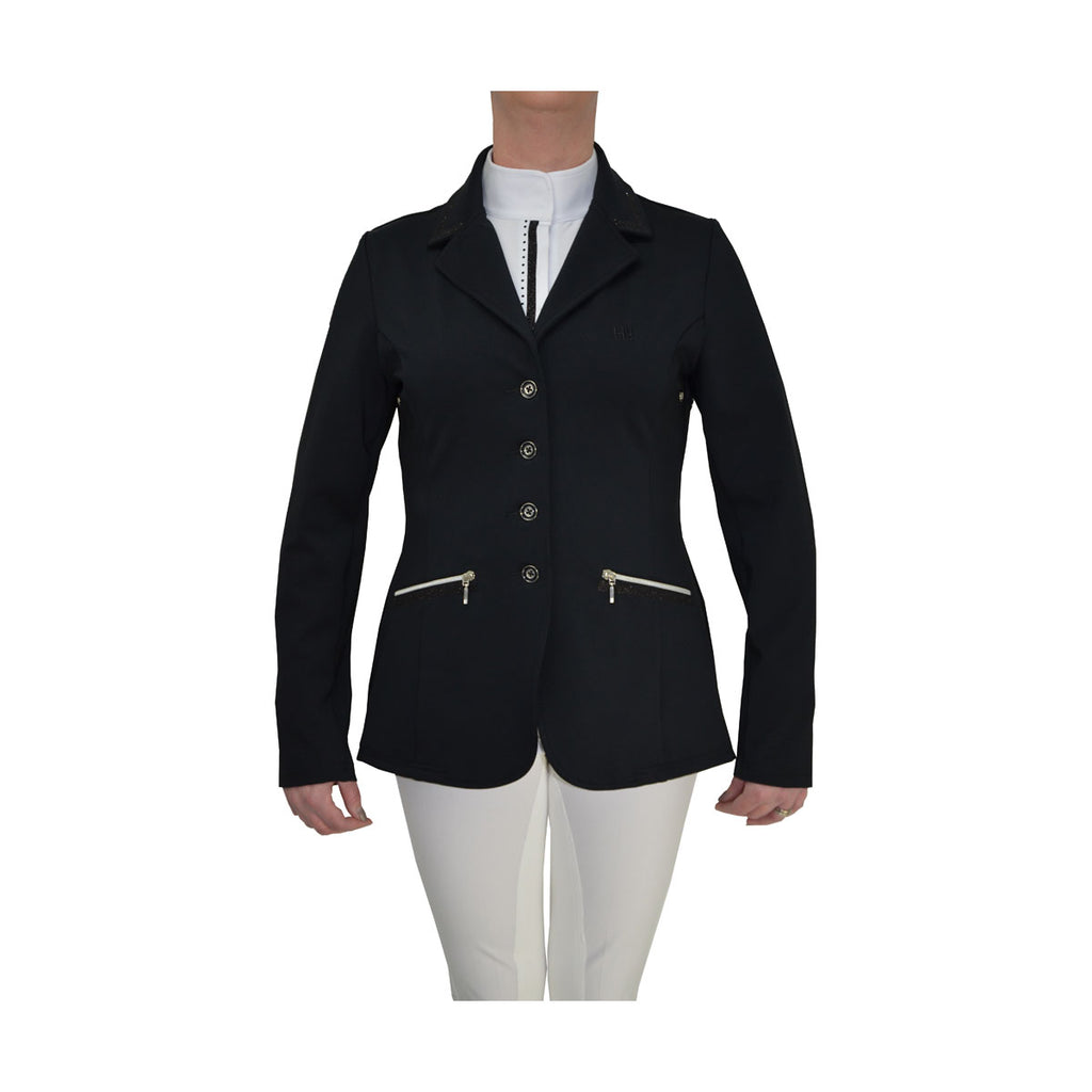 This gorgeous show jacket is the essential addition to your competition wardrobe! The sophisticated design incorporates black glitter panels along the collar that catch the light, matching the black glitter panels that line the silver zipped pockets. Designed with softshell material to guard against light showers and offer flexibility in the saddle, the comfort of this jacket is enhanced with the air vents under the arms to help you keep cool. Fastened with four silver lined black buttons for a secure fit, this show jacket is the ultimate choice for those who want to make an impression.