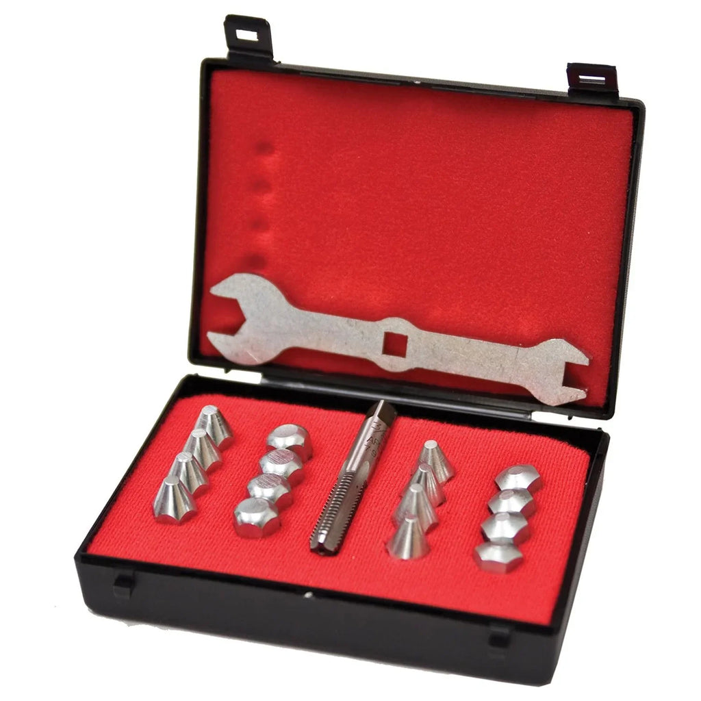 A black presentation box containing a selection of 16 assorted studs (standard, pointed, road and dome) and tap and spanner. Ideal for use at shows.