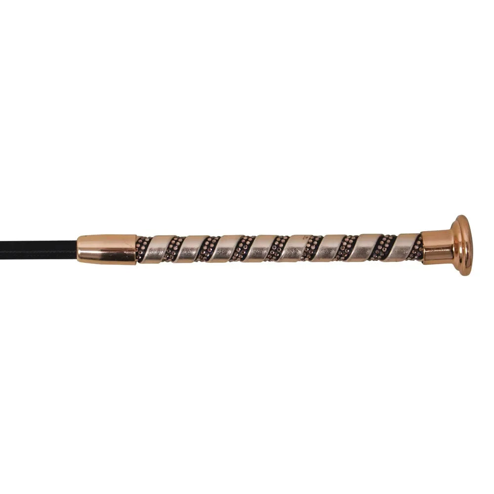 Set the trend with this beautiful dressage whip which features a fashionable rose gold handle with a spiral of rose gold crystals in a double row. A matching rose gold cap ensures a practical grip when in use. A plain black shaft completes the understated, classical look.