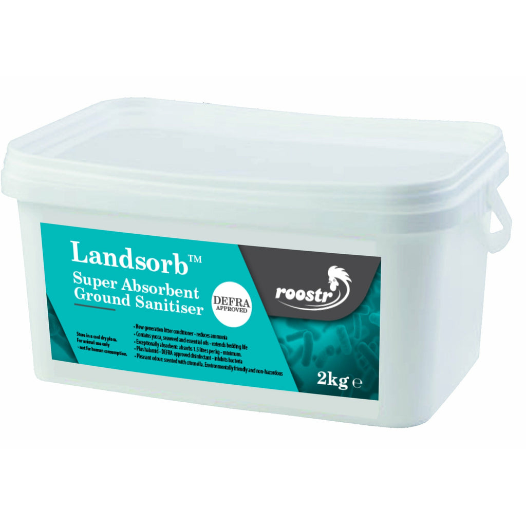 Landsorb is a 'New Generation' ground sanitizer and super absorbent powder but with the Halamid (Defra Approved) disinfectant powder added as a bouns, for improved germ-killing properties. Natural ingredients, including yucca (combats ammonia), seaweed and essential oils, plus Halamid. Landsorb absorbs at least 1.5lt of water per kilo of product making it one of the most absorbent powder available - considerably more than competitive products. It forms dry clumps which are easy to remove. Use for poultry and game runs to keep the area round drinkers dry, for dairy stalls, lambing and farrowing areas. Highly recommended for drying off new-born piglets. It is scented with citronella to keep the house smelling pleasant and contains a Defra approved disinfectant called Halamid to keep the coop sanitised. Use at the rate of 50g / square meter a week to maintain a safe and pleasant chicken coop. Also suitable for most other animals including pigs, cattle, horses and sheep.