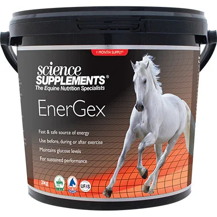 EnerGex is ideal for use before, during and following exercise to support energy delivery. It can also be used as an energy booster in lethargic horses and to maintain blood glucose levels in situations where food intake is decreased, such as during travelling or when appetite is reduced. EnerGex is a safer source of carbohydrate (energy) compared with simple sugars which can lead to adverse effects on behaviour and performance. It is low-glycaemic meaning it leads to a slower rate of glucose entry into the blood, avoiding high peaks and sudden drops in blood glucose levels. This leads to a more balanced and prolonged energy supply. EnerGex also supports improved fat oxidation during physical activity as high levels hinder the use of lipids (fat) as an energy source. Energex can increase the utilisation of fat during exercise, thus enhancing endurance performance. EnerGex provides 1674kJ per 100g
