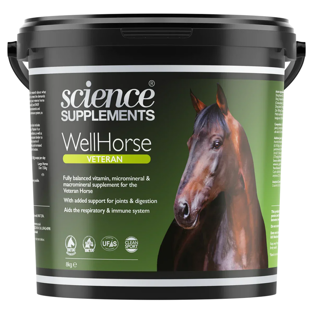 Science Supplements is supported by 50 years of scientific research into what individual horses and ponies require and is formulated to meet the demands of the older horse. It contains every important nutrient your veteran horse requires and meets the NRC (National Research Council) and BASF (Animal Nutrition) recommendations for vitamins, microminerals and macrominerals and also supports joint health and the immune system, to keep your older horse as active as ever. Horses' nutritional requirements change as they age and WELLHORSE VETERAN has been formulated to safely satisfy this specific need. In addition to vitamins and minerals, WELLHORSE VETERAN also includes a source of highly bioavailable D-Biotin (also known as Vitamin H or Vitamin B7) to support hoof growth, skin and coat condition, as well as containing an innovative protected live yeast and a mycotoxin binder to support a healthy GI tract. WELLHORSE VETERAN also provides a high quality source of Glucosamine and MSM to help support joints, and increased levels of Vitamin E and C to aid respiratory and muscle function.
