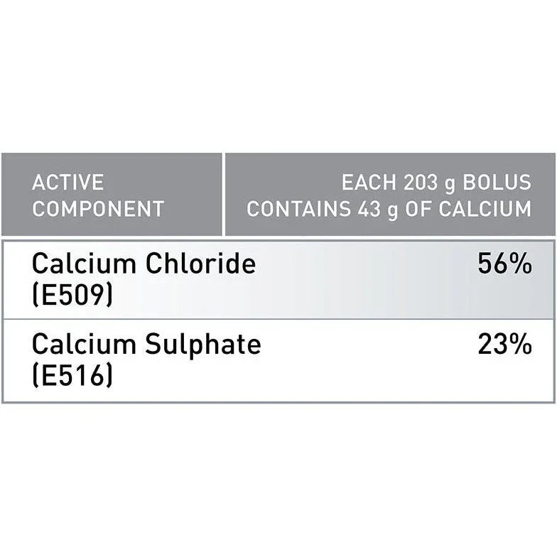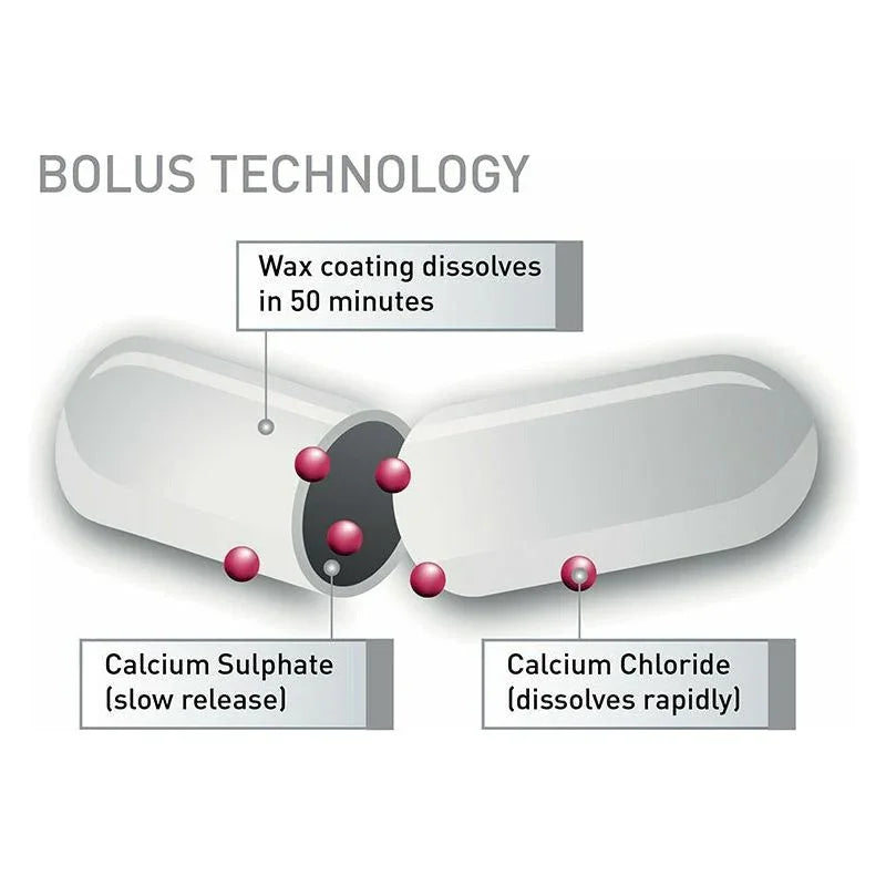 After administering boluses, the coating on the bolus dissolves in the rumen and the bolus disintegrates completely within a 50 minute period.  The calcium chloride is rapidly absorbed, and the calcium sulphate is absorbed over a longer period, giving a sustained supply of calcium.