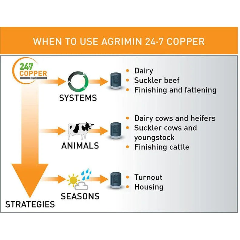 24·7 COPPER CATTLE is designed for situations where soil and forage copper levels are low or where known copper antagonists such as molybdenum, iron and sulphur are high.