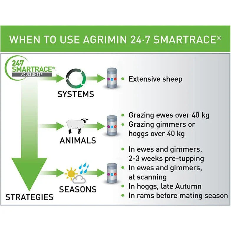 24·7 SMARTRACE® ADULT SHEEP is designed for situations where iodine, cobalt and selenium supplementation is essential in the run up to tupping, at scanning or over-wintering. It can also be given to rams in advance of the mating season.