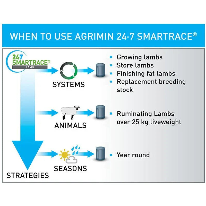24·7 SMARTRACE® LAMB is designed for situations where iodine, cobalt and selenium supplementation is essential for growing, ruminating lambs to help maintain and maximise growth rates, ensuring strong vital lambs.