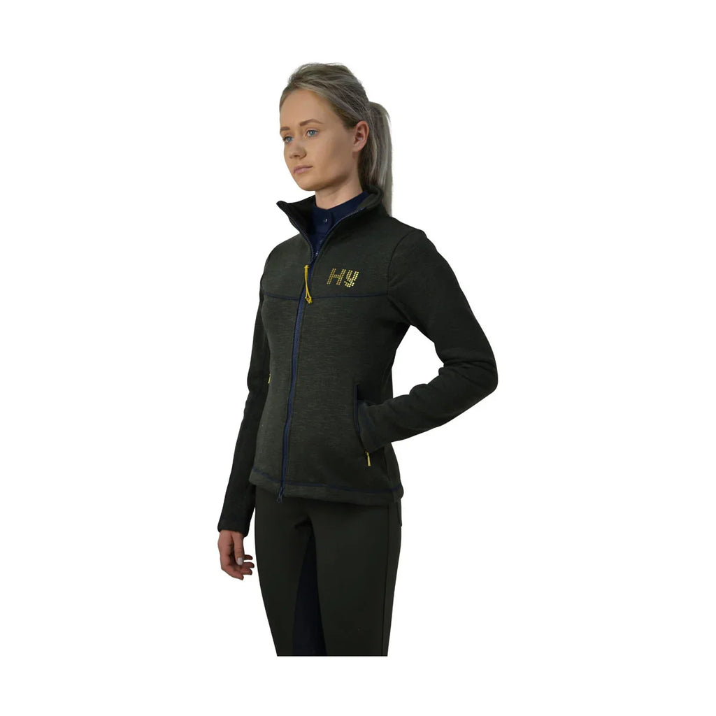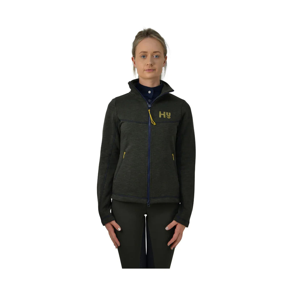 A smart and sophisticated soft fleece jacket made from durable fabric which offers the hard working rider a practical yet stylish garment. This fleece is enhanced with useful features such as a double zip fastening, allowing you to adjust the fit whilst in the saddle, and deep zip pockets to keep your possessions secure. Finished with a contrasting navy zip and stitching, a gold 'X' on the back and the Hy emblem on the chest. This versatile jacket can be worn on the yard or is smart enough for leisure wear too. Size X-Small